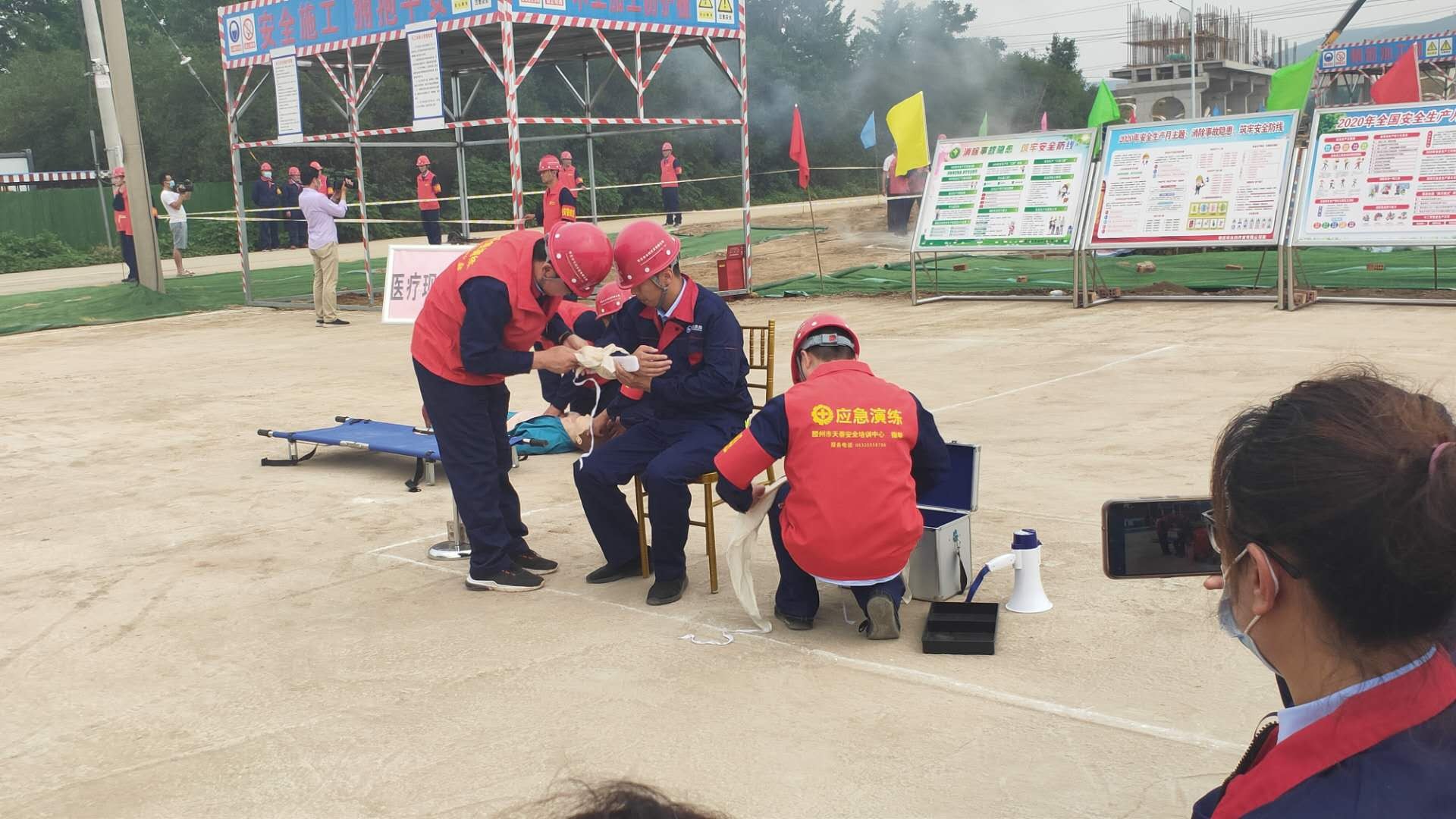 本次演練模擬事故情形為:市中區(qū)東王莊閘除險(xiǎn)加固工程施工現(xiàn)場(chǎng),模板加工廠電線線路短路引發(fā)火災(zāi),員工在實(shí)施初級(jí)滅火救援中1人不慎觸電,1人在施救時(shí)受到機(jī)械傷害,公司啟動(dòng)《棗莊市水利開發(fā)有限公司生產(chǎn)安全事故綜合應(yīng)急預(yù)案》一級(jí)響應(yīng)。成立現(xiàn)場(chǎng)指揮部,指揮各救援職能組應(yīng)急救援隊(duì)伍進(jìn)行快速、準(zhǔn)確的滅火救援,對(duì)傷者進(jìn)行CPR及止血、包扎、固定、搬運(yùn)等救護(hù)技能操作,在各救援職能組的全力配合下,圓滿完成此次應(yīng)急救援任務(wù)。